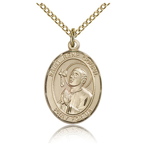 Die struck, hand-engraved medal. Inscription: SAINT RENE GOUPIL PRAY FOR US. Free 18-inch sterling silver lite curb chain with lobster clasp. Dimensions: 3/4in x 1/2in. This item is the size of a penny. Made in USA.
