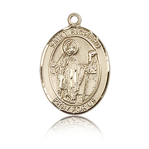 Die struck, hand-engraved medal is made of polished, solid 14kt yellow gold. Inscription: SAINT RICHARD PRAY FOR US. Dimensions: 3/4in x 1/2in. This item is the size of a penny. Made in USA.