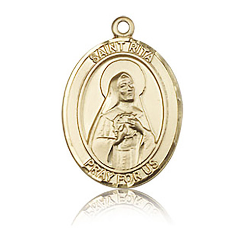 Die struck, hand-engraved medal is made of polished, solid 14kt yellow gold. Inscription: SAINT RITA PRAY FOR US. Dimensions: 3/4in x 1/2in. This item is the size of a penny. Made in USA.