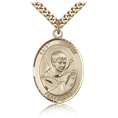 Die struck, hand-engraved oval St Robert medal is made of gold-plated sterling silver. Dimensions: 1in x 3/4in. Inscription: SAINT ROBERT PRAY FOR US. Free 24-inch stainless steel, endless heavy curb chain with gold plating. This item is the size of a quarter. Made in USA.