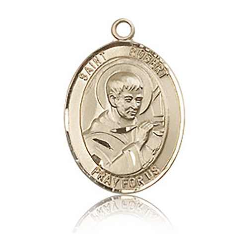 Die struck, hand-engraved St Robert Bellarmine medal is made of polished, solid 14k yellow gold. Inscription: SAINT ROBERT PRAY FOR US. Dimensions: 3/4in x 1/2in. This item is the size of a penny. Made in USA.