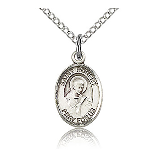 This small oval sterling silver St Robert Bellarmine charm dangles from a sterling silver 18in lite curb chain with lobster clasp. Plain back. Dimensions: 1/2in x 1/4in. This item is half the size of a quarter. Die struck, hand-engraved. Made in USA.