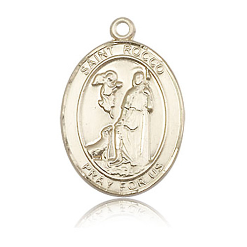 Die struck, hand-engraved St Rocco medal is made of polished, solid 14k yellow gold. Inscription: SAINT ROCCO PRAY FOR US. Dimensions: 1in x 3/4in. This item is the size of a quarter. Made in USA.