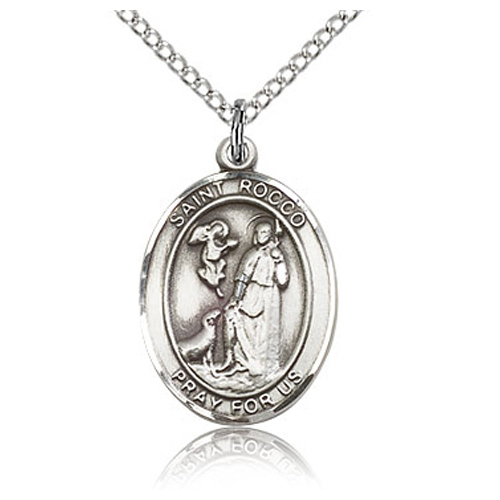 Sterling silver oval St Rocco medal dangles from an 18-inch sterling silver lite curb chain with lobster clasp. Dimensions: 3/4in x 1/2in. This item is the size of a penny. Inscription: SAINT ROCCO PRAY FOR US. Die struck, hand-engraved. Made in USA.