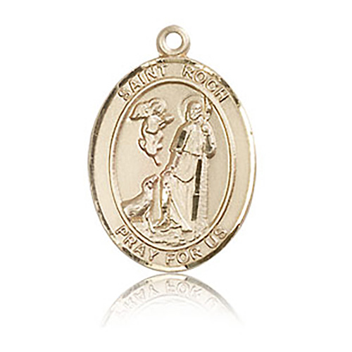 Die struck, hand-engraved medal is made of polished, solid 14kt yellow gold. Inscription: SAINT ROCH PRAY FOR US. Dimensions: 3/4in x 1/2in. This item is the size of a penny. Made in USA.