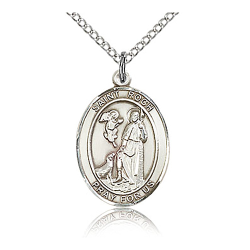 This ladies' sterling silver St Roch medal dangles from a sterling silver 18in lite curb chain with lobster clasp. 3/4in x 1/2in. This item is the size of a penny. Inscription: SAINT ROCH PRAY FOR US. Die struck, hand-engraved medal. Made in USA.