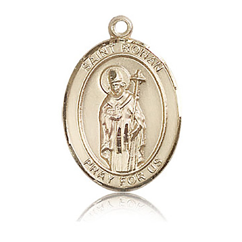 Die struck, hand-engraved St Ronan medal is made of polished, solid 14k yellow gold. Inscription: SAINT RONAN PRAY FOR US. Dimensions: 1in x 3/4in. This item is the size of a quarter. Made in USA.