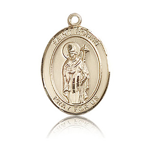 Die struck, hand-engraved medal is made of polished, solid 14kt yellow gold. Inscription: SAINT RONAN PRAY FOR US. Dimensions: 3/4in x 1/2in. This item is the size of a penny. Made in USA.