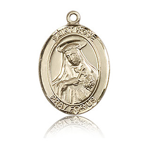 Die struck, hand-engraved medal is made of polished, solid 14kt yellow gold. Inscription: SAINT ROSE PRAY FOR US. Dimensions: 3/4in x 1/2in. This item is the size of a penny. Made in USA.