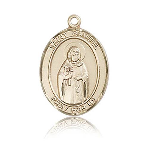 This ladies' 14k yellow gold oval St Samuel medal is die struck and hand-engraved.Inscription: SAINT SAMUEL PRAY FOR US. Dimensions: 3/4in x 1/2in. This item is the size of a penny. Made in USA.