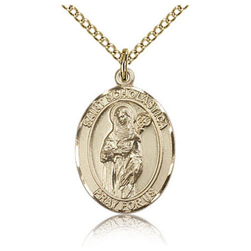 This oval St Scholastica medal is made of gold filled sterling silver. Inscription: SAINT SCHOLASTICA PRAY FOR US. 18-inch gold-plated sterling silver lite curb chain has a lobster clasp. Dimensions: 3/4in x 1/2in. This item is the size of a penny. Made in USA.