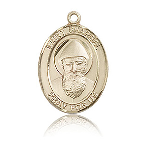 This ladies' 14k yellow gold oval St Sharbel medal is die struck and hand-engraved. Inscription: SAINT SHARBEL PRAY FOR US. Dimensions: 3/4in x 1/2in. This item is the size of a penny. Made in USA.