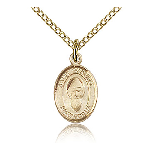 This very small gold filled oval St Sharbel charm dangles from a gold plated sterling silver 18-inch lite curb chain with lobster clasp. Plain back. Dimensions: 1/2in x 1/4in. This item is half the size of a quarter. Made in USA.