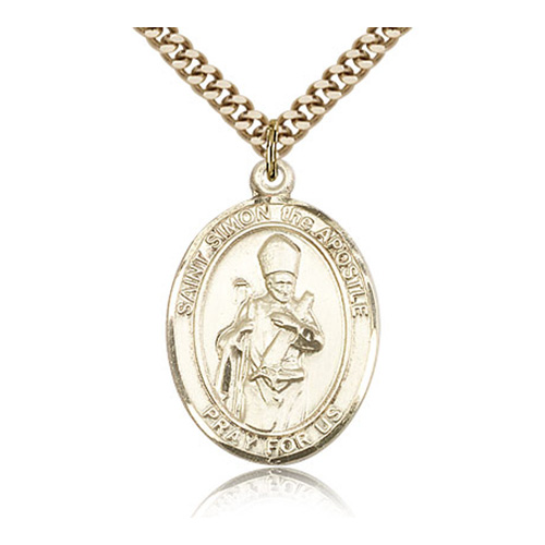 This oval St. Simon medal is made of gold-filled sterling silver. Inscription: SAINT SIMON PRAY FOR US. 24-inch stainless steel, endless heavy curb chain with gold plating. Dimensions: 1in x 3/4in. This item is the size of a quarter. Die struck, hand-engraved medal. Made in USA.