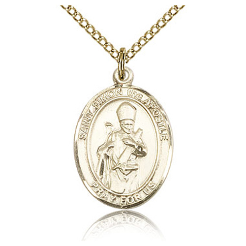 Gold-filled sterling silver oval St Simon medal dangles from a gold-plated sterling silver 18in curb chain with lobster clasp. Inscription: SAINT SIMON PRAY FOR US. Dimensions: 3/4in x 1/2in. This item is the size of a penny. Made in USA.