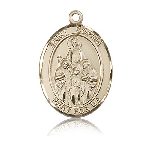 Die struck, hand-engraved St Sophia medal is made of polished, solid 14k yellow gold. Inscription: SAINT SOPHIA PRAY FOR US. Dimensions: 1in x 3/4in. This item is the size of a quarter. Made in USA.