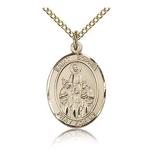 This gold-filled St Sophia medal includes a gold-plated sterling silver 18in lite curb chain with lobster clasp. 3/4in x 1/2in. This oval medal is the size of a penny. Inscription: SAINT SOPHIA PRAY FOR US. Die struck, hand-finished. Made in USA.