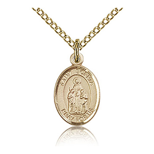 Die struck, hand-engraved St Sophia charm is made of gold filled sterling silver. 18-inch gold plated, sterling silver lite curb chain with lobster clasp. Plain back. Dimensions: 1/2in x 1/4in. This item is half the size of a quarter. Made in USA.