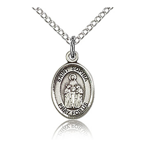 This small oval St Sophia charm is made of sterling silver. 18-inch sterling silver lite curb chain with lobster clasp. Plain back. Dimensions: 1/2in x 1/4in. This item is half the size of a quarter. Die struck, hand-engraved. Made in USA.