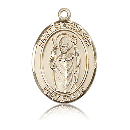 Die struck, hand-engraved medal is made of polished, solid 14kt yellow gold. Inscription: SAINT STANISLAUS PRAY FOR US. Dimensions: 1in x 3/4in. This item is the size of a quarter. Made in USA.