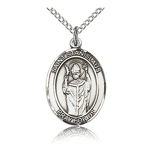 Sterling silver oval Saint Stanislaus medal dangles from a sterling silver 18in curb chain with lobster clasp. 3/4in x 1/2in. This medal is the size of a penny. Inscription: SAINT STANISLAUS PRAY FOR US. Die struck, hand-engraved. Made in USA.
