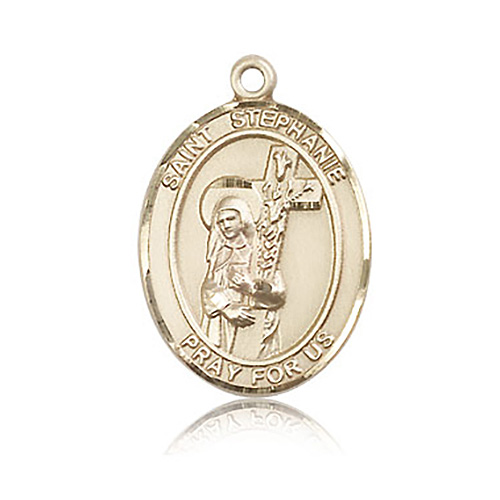 Die struck, hand-engraved St Stephanie medal is made of polished, solid 14k yellow gold. Inscription: SAINT STEPHANIE PRAY FOR US. Dimensions: 1in x 3/4in. This item is the size of a quarter. Made in USA.