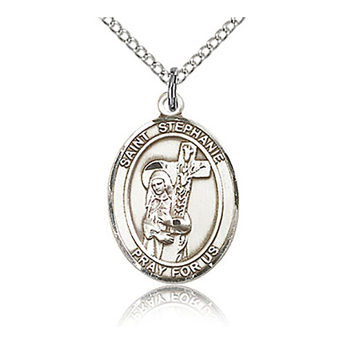 Sterling silver oval St. Stephanie medal dangles from a 18-inch sterling silver lite curb chain with lobster clasp. Dimensions: 3/4in x 1/2in. This item is the size of a penny. Inscription: SAINT STEPHANIE PRAY FOR US. Die struck, hand-engraved. Made in USA.
