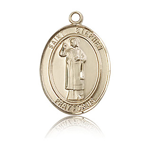 This oval St Stephen medal is made of polished, solid 14k yellow gold. Inscription: SAINT STEPHEN PRAY FOR US. Dimensions: 3/4in x 1/2in. This item is the size of a penny. Die struck, hand-engraved. Made in USA.