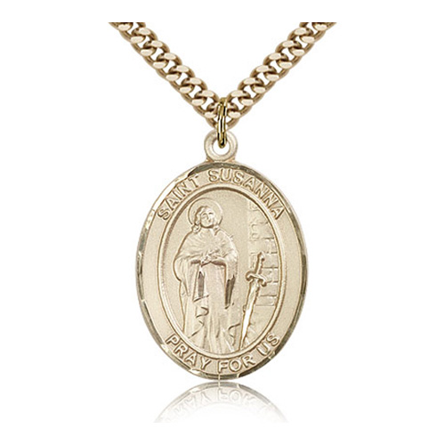 Gold filled sterling silver oval St Susanna medal dangles from a 24-inch stainless steel, endless heavy curb chain with gold plating. Die struck, hand-engraved. Inscription: SAINT SUSANNA PRAY FOR US. Dimensions: 1in x 3/4in. This item is the size of a quarter. Made in USA.