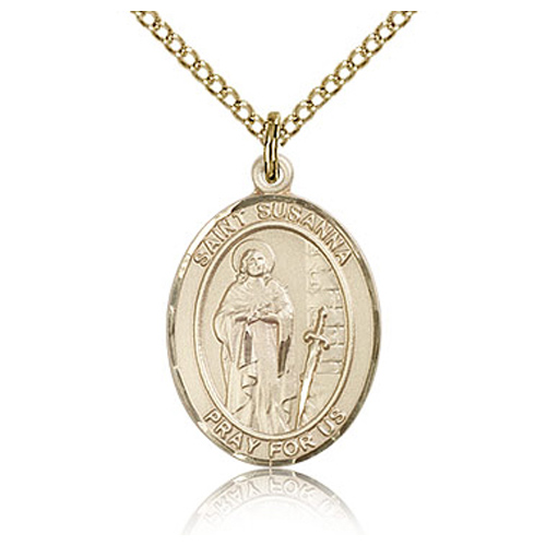 This gold-filled Saint Susanna medal includes a gold-plated sterling silver 18in lite curb chain with lobster clasp. 3/4in x 1/2in. This oval medal is the size of a penny. Inscription: SAINT SUSANNA PRAY FOR US. Die struck, hand-finished. Made in USA.