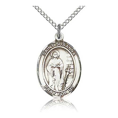 This sterling silver Saint Susanna medal dangles from a sterling silver 18in curb chain with lobster clasp. 3/4in x 1/2in. This oval medal is the size of a penny. Inscription: SAINT SUSANNA PRAY FOR US. Die struck, hand-finished. Made in USA.