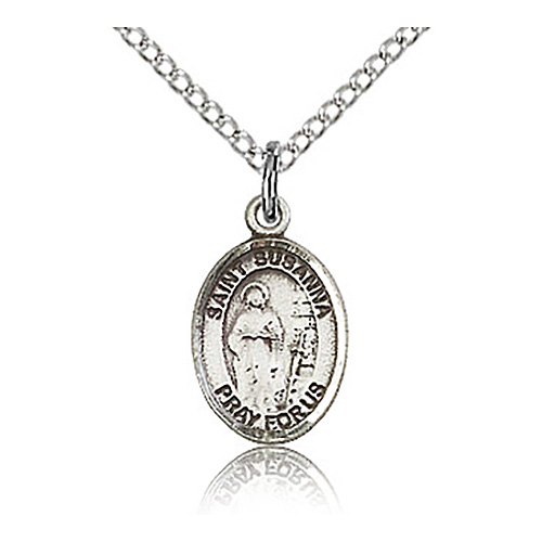 Die struck, hand-engraved St Susanna charm. Free 18-inch sterling silver lite curb chain with lobster clasp. Plain back. Dimensions: 1/2in x 1/4in. This item is half the size of a quarter. Made in USA.
