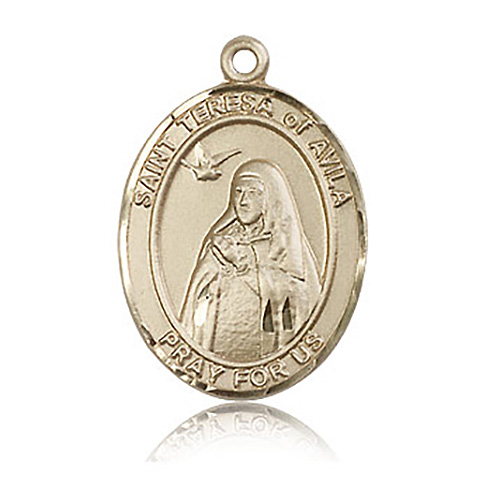 Die struck, hand-engraved medal is made of polished, solid 14kt yellow gold. Inscription: SAINT TERESA of AVILA PRAY FOR US. Dimensions: 1in x 3/4in. This item is the size of a quarter. Made in USA.
