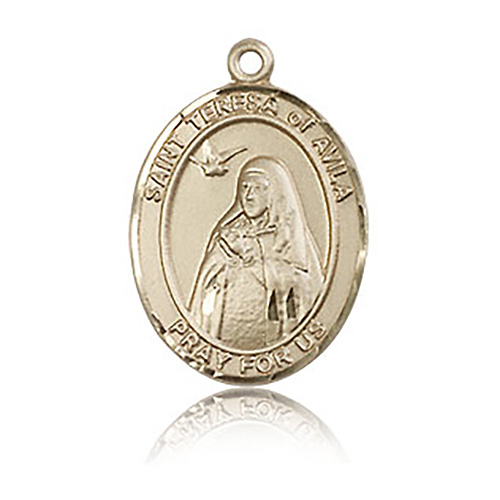 Die struck, hand-engraved medal is made of polished, solid 14kt yellow gold. Inscription: SAINT TERESA of AVILA PRAY FOR US. Dimensions: 3/4in x 1/2in. This item is the size of a penny. Made in USA.