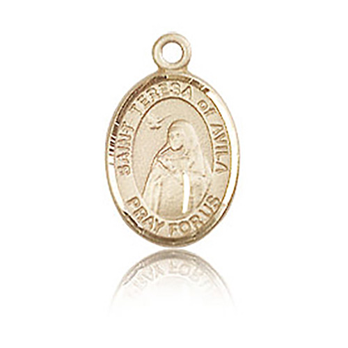 This very small St Teresa of Avila medal is made of polished, solid 14k yellow gold. Inscription: SAINT TERESA of AVILA PRAY FOR US. Dimensions: 1/2in x 1/4in. This item is half the size of a quarter. Made in USA.