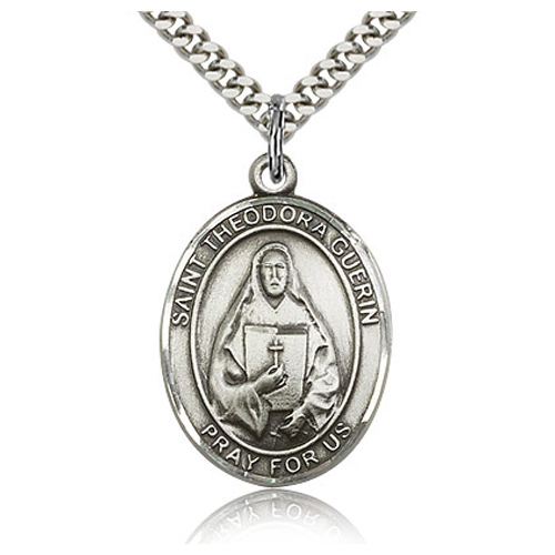 This men's St Theodora Guerin medal is made of solid sterling silver. Inscription: SAINT THEODORA GUERIN PRAY FOR US. 24-inch stainless steel, endless heavy curb chain with silver plating. Dimensions: 1in x 3/4in. This item is the size of a quarter. Die struck, hand-engraved medal. Made in USA.