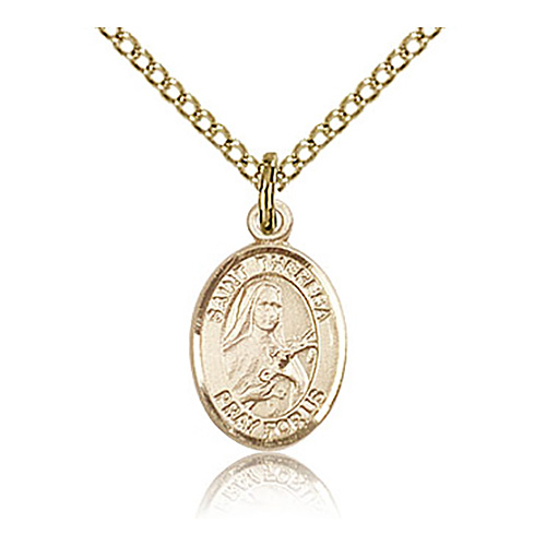 St Theresa charm is made of gold filled sterling silver. 18-inch gold plated, sterling silver lite curb chain with lobster clasp. Plain back. Dimensions: 1/2in x 1/4in. This item is half the size of a quarter. Die struck, hand-engraved. Made in USA.