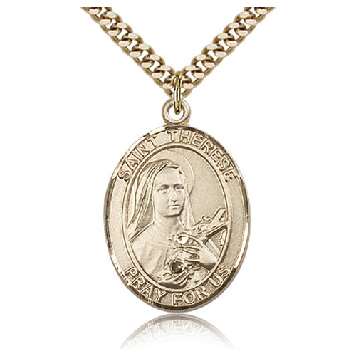 This oval St Therese of Lisieux medal is made of gold filled sterling silver. Inscription: SAINT THERESE of LISIEUX PRAY FOR US. 24-inch gold-plated stainless steel, endless heavy curb chain. Dimensions: 1in x 3/4in. This item is the size of a quarter. Made in USA. Die struck, hand-engraved medal.