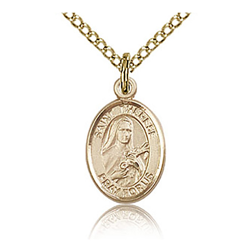 Die struck, hand-engraved St Therese of Lisieux charm is made of gold filled sterling silver. Gold plated sterling silver 18-inch curb chain has a lobster clasp. Plain back. Dimensions: 1/2in x 1/4in. This item is half the size of a quarter. Made in USA.