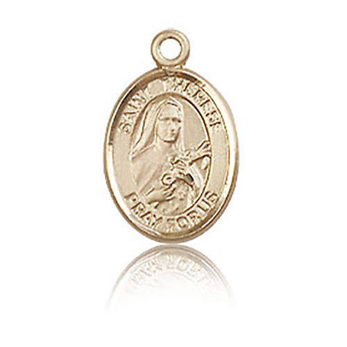 This tiny St Therese of Lisieux medal is made of polished, solid 14k yellow gold. Inscription: SAINT THERESE of LISIEUX PRAY FOR US. Dimensions: 1/2in x 1/4in. This item is half the size of a quarter. Made in USA.