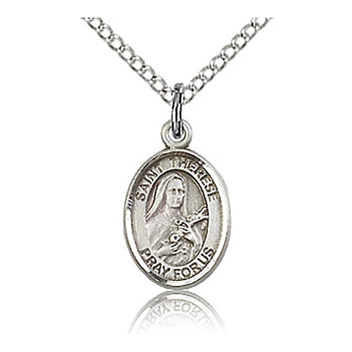 Die struck, hand-engraved St Therese of Lisieux charm. Sterling silver 18-inch lite curb chain with lobster clasp. Plain back. Dimensions: 1/2in x 1/4in. This item is half the size of a quarter. Made in USA.