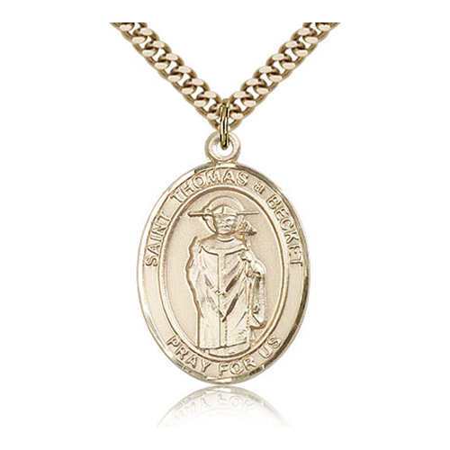Gold filled sterling silver oval St Thomas A Becket medal dangles from a 24-inch stainless steel, endless heavy curb chain with gold plating. Die struck, hand-engraved. Inscription: SAINT THOMAS A BECKET PRAY FOR US. Dimensions: 1in x 3/4in. This item is the size of a quarter. Made in USA.