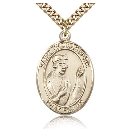 Gold-filled sterling silver 1in St Thomas medal dangles from a 24-inch stainless steel, endless heavy curb chain with gold plating. Dimensions: 1in x 3/4in. This item is the size of a quarter. Inscription: SAINT THOMAS MORE PRAY FOR US. Made in USA.