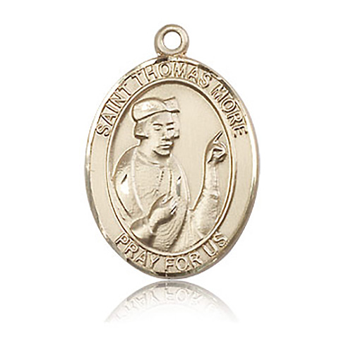 Die struck, hand-engraved medal is made of polished, solid 14kt yellow gold. Inscription: SAINT THOMAS MORE PRAY FOR US. Dimensions: 1in x 3/4in. This item is the size of a quarter. Made in USA.