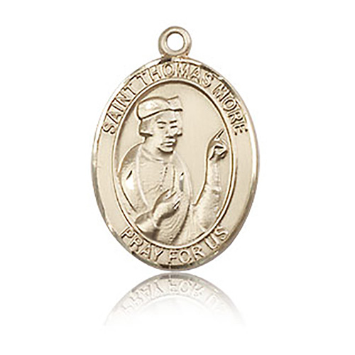 Die struck, hand-engraved medal is made of polished, solid 14kt yellow gold. Inscription: SAINT THOMAS MORE PRAY FOR US. Dimensions: 3/4in x 1/2in. This item is the size of a penny. Made in USA.