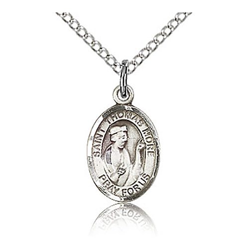 Sterling silver oval St Thomas More charm dangles from a sterling silver 18in lite curb chain with lobster clasp. Plain back Plain back. Dimensions: 1/2in x 1/4in. This item is half the size of a quarter. Made in USA.