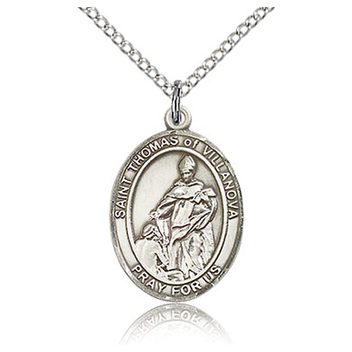 This sterling silver Saint Thomas of Villanova medal dangles from a sterling silver 18in curb chain with lobster clasp. 3/4in x 1/2in. This oval medal is the size of a penny. Inscription: SAINT THOMAS of VILLANOVA PRAY FOR US. Die struck, hand-finished. Made in USA.