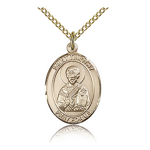 This oval Saint Timothy medal s made of gold-filled sterling silver and includes a gold-plated sterling silver 18in curb chain with lobster clasp. Medal size: 3/4in x 1/2in. This item is the size of a penny. Inscription: SAINT TIMOTHY PRAY FOR US. Made in USA.