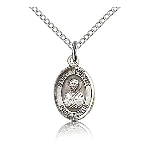 Sterling silver small oval St Timothy charm dangles from a sterling silver 18-inch lite curb chain with lobster clasp. Plain back. Dimensions: 1/2in x 1/4in. This item is half the size of a quarter. Die struck, hand-engraved. Made in USA.