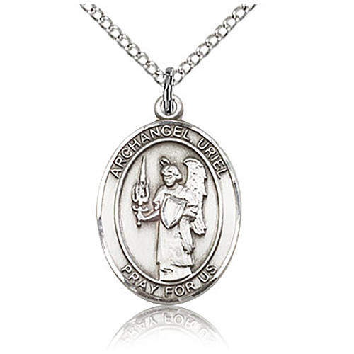 This sterling silver oval Saint Thomas medal dangles from a sterling silver 18in curb chain with lobster clasp. 3/4in x 1/2in. This medal is the size of a penny. Inscription: ARCHANGEL PRAY FOR US. Die struck, hand-finished. Made in USA.